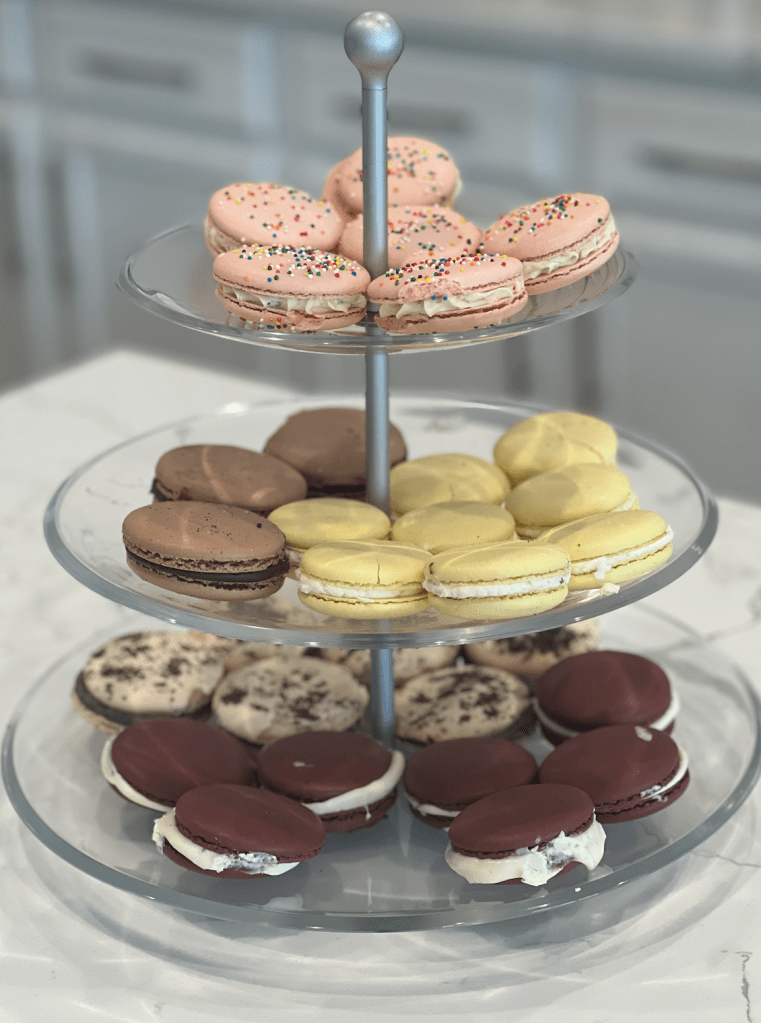 In this recipe, I am sharing 4 different flavors of French macarons: Red Velvet, Chocolate, Cookies and Cream, and Birthday Cake. All of the flavors but Chocolate and Red Velvet share the same base recipe.
